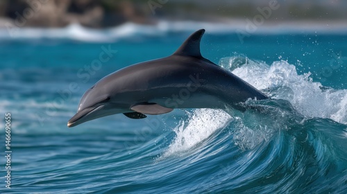 Fototapeta premium Wild dolphin jumping high in front of crashing wave, background softened with...