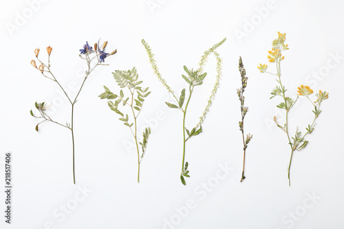 Fototapeta premium Wild dried meadow flowers on white background, top view