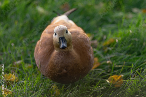 © Eselena, Obraz premium Wild duck Ruddy Shelduck in nature close-up on blurred background.