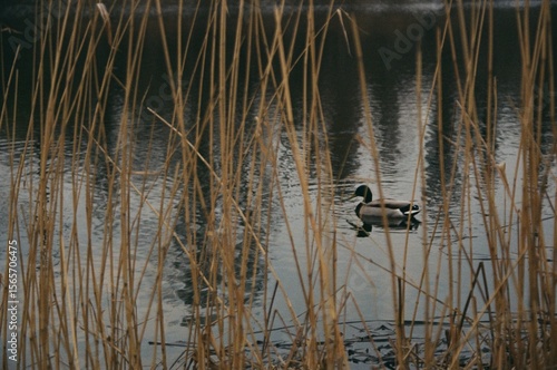 © Дмитро Ганжеєв, Fototapeta premium Wild Duck Swimming Behind Dry Reeds on Film