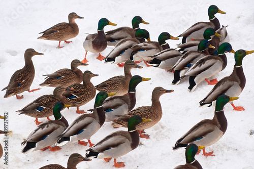 © Maya, Obraz premium wild ducks on a frozen snow-covered lake. winter landscape