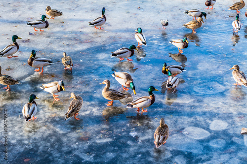 Fototapeta premium Wild ducks on the lake ice in the spring in city park