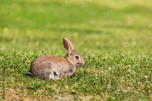 © Rixie, Fototapeta premium Wild European rabbit, oryctolagus cuniculus, on green grass background, Hampshire, UK