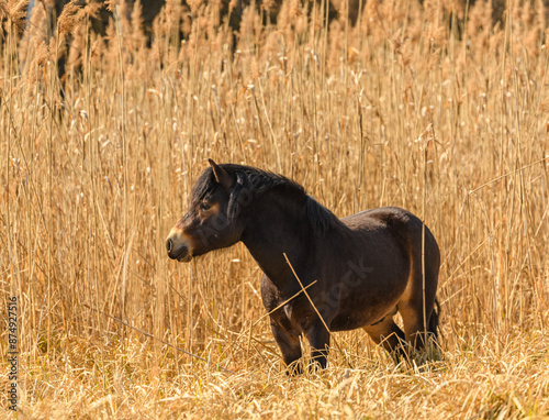 © Petr, Fototapeta premium wild exmoor pony standing in dry reeds