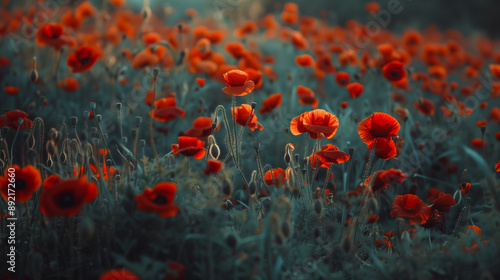 © MariКа, Obraz premium wild field blooms with vibrant red poppies at sunset