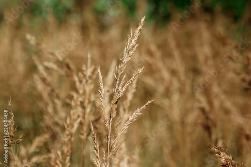 © Aliaksandr Marko, Fototapeta premium Wild field of grass on sunset, soft sun rays, warm tonight, lens flares