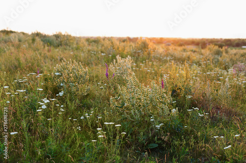 Fototapeta premium Wild flowers and grass at summer meadow at sunset