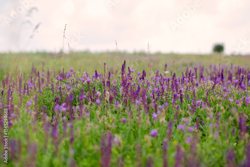 © liubovyashkir, Naklejka premium Wild flowers on meadow cloudy blue sky. Summer day field grass, cloud sky. field, summer landscape