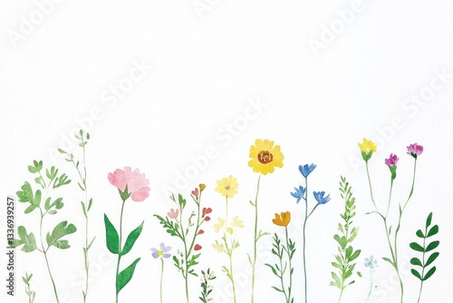 © Rawpixel.com, Naklejka premium Wild flowers with green leaves border illustration watercolor colorful.