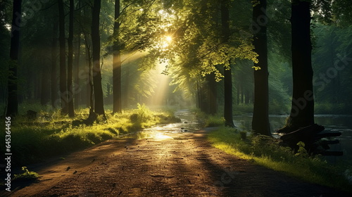 © Aleksandr, Naklejka premium wild forest trees with sun ray on field and lake,river at sunset