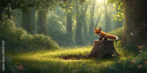 © TheWaterMeloonProjec, Obraz premium Wild fox among trees and a fallen stump in a forest setting, highlighting habitat preservation efforts