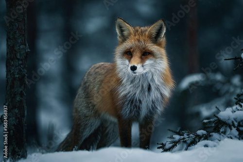 Fototapeta premium Wild fox standing alert in a snowy forest, natural winter environment, sharp...
