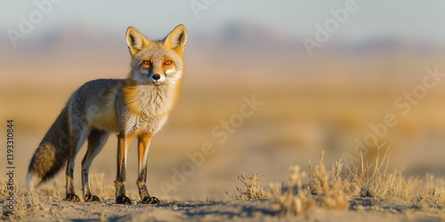 Fototapeta premium Wild fox standing alert in arid landscape at golden hour