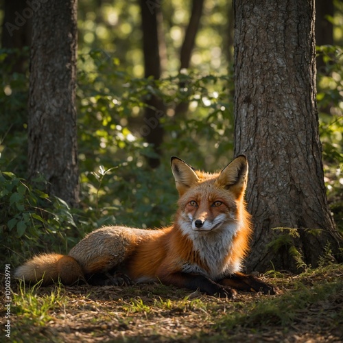 © M, Obraz premium Wild fox stretching and sleeping in natural animal environment outdoors red fox in the woods.A majestic lion standing in a forest clearing, with tall trees surrounding it.