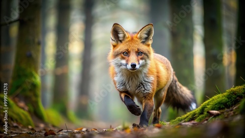 © sawaratch, Fototapeta premium Wild fox with fiery fur running through forest, fox, fire, flames, wilderness, animal, nature, vibrant, red, orange, wildlife