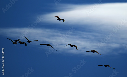 © Paul, Fototapeta premium Wild geese on pond, road and flying.