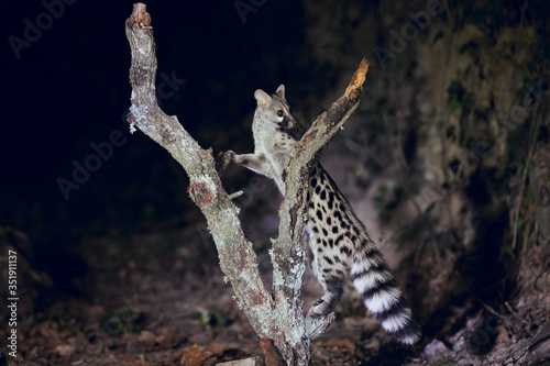 © Aitor, Obraz premium wild genet looking for food and climbing tree trunk at night