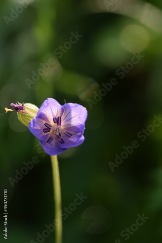 © Anna, Obraz premium Wild geraniums flower closeup on bokeh green meadow, floral background.