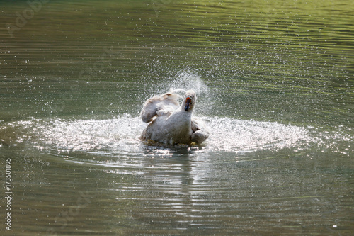 © Vladimir Zhupanenko, Fototapeta premium Wild goose splashing in the lake on a warm autumn day