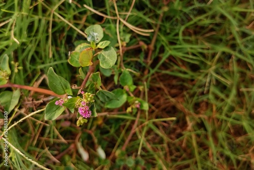 Naklejka premium Wild grass and small purple flowers blooming in nature