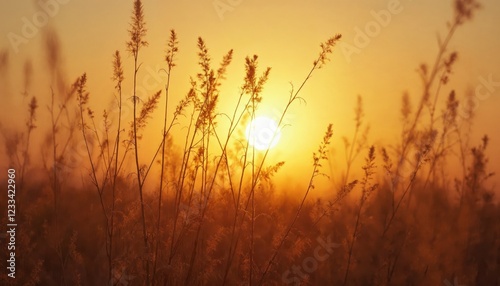 Obraz premium Wild grass field at golden sunset. Concept of nature, beauty, and tranquility.