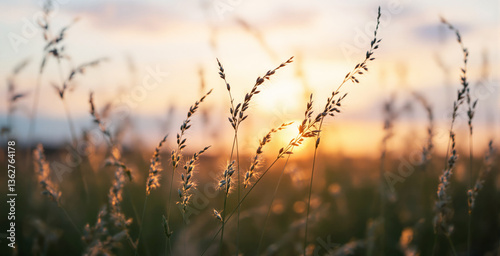 Obraz premium Wild grass stalks in a bright sunset light, creating a warm and peaceful...