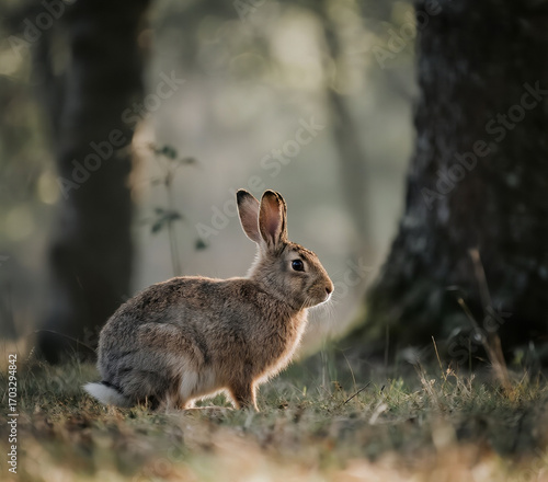 © David, Fototapeta premium Wild Hare in the Forest Rabbit Among Trees Nature Wildlife Scene with Hare