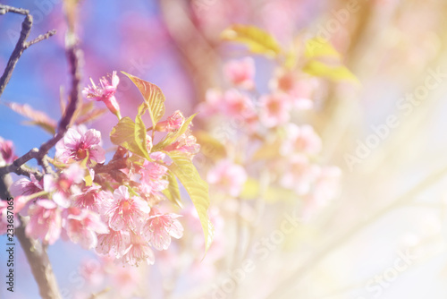 © Sakuramos, Fototapeta premium Wild Himalayan Cherry blossoms with copy space and morning light.