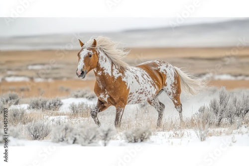 Obraz premium Wild horse galloping through snowy landscape in western plains during winter season