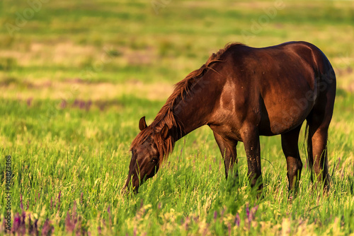 © Yakov, Fototapeta premium Wild horse grazes in the sunlit meadow