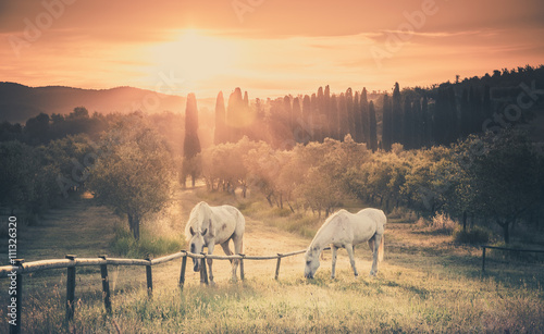 © Maciej Czekajewski, Fototapeta premium Wild horses and tuscan sunrise
