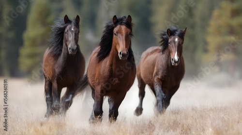 © Thares2020, Fototapeta premium Wild horses galloping across a sun drenched meadow