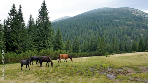© Bohdan, Obraz premium wild horses grazing on a meadow, spruces and mountains covered with spruce forest