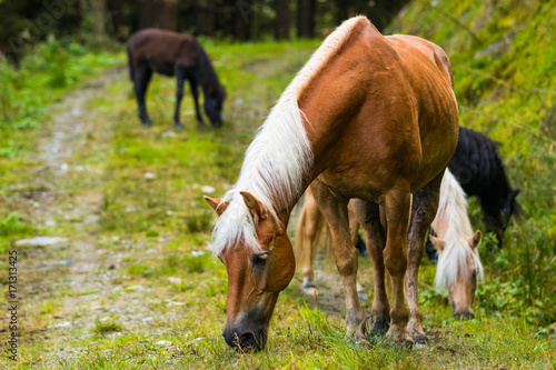 © dtatiana, Fototapeta premium Wild horses in forest of Austria