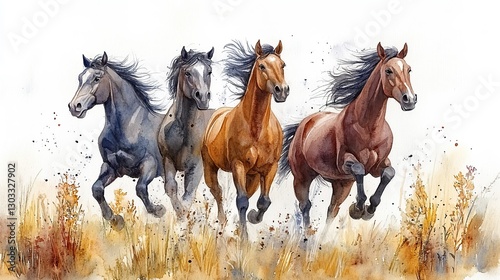 © Knight, Fototapeta premium wild horses on meadow clipart isolated watercolor element illustration detailed illustration