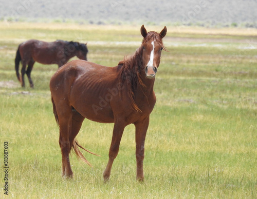 Fototapeta premium Wild horses roaming the Adobe Valley floor and foothills, in the Eastern...