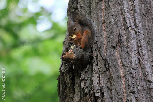 © mex99, Obraz premium Wild Japanese Squirrel Holding Chestnut in Forest.