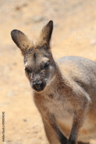 © shubas, Fototapeta premium Wild kangaroos on sand background, close up. Wildlife animals Australia.