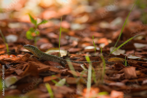© Couperfield, Fototapeta premium Wild lizard Lacerta agilis near human summer house in sunny day