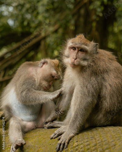 Fototapeta premium Wild macaque monkey being groomed in Bali forest