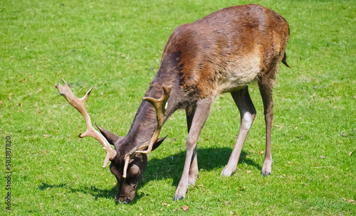 Naklejka premium Wild male fallow deer with antlers on a meadow