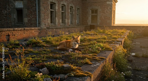© Ariestia, Obraz premium Wild mammal rests peacefully on overgrown rooftop terrace against warm sunset light