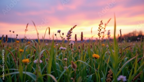 © Namwan, Fototapeta premium wild medicinal plants growing among tall grass in open field under pastel dawn sky representing organic healing themes