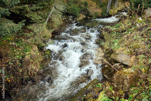 Fototapeta premium Wild mountain river flowing through stone boulders. Abundant clear stream in...
