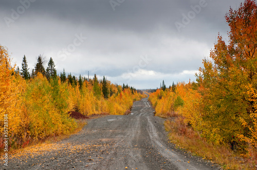 © lexan, Fototapeta premium Wild mountain road in deep taiga forest, Komi region, Russia.