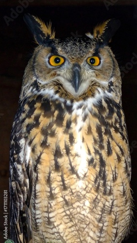 © Arfin Studio, Fototapeta premium Wild Owl with Large Eyes and Feathers Isolated on Dark Background for Bird Animal Object and Nocturnal Wildlife Concept