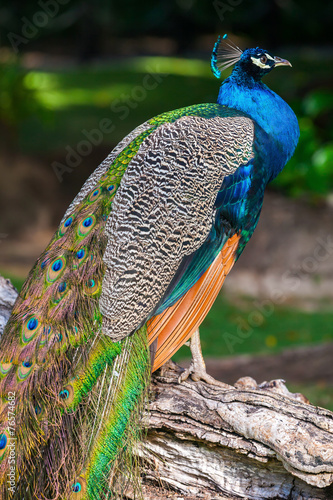 © evannovostro, Fototapeta premium Wild Peacock sitting on old tree in tropical forest