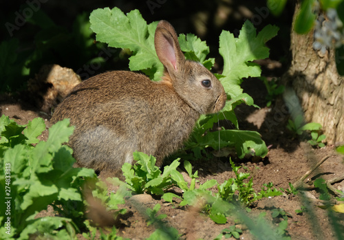 Fototapeta premium Wild rabbit feeding in urban house garden.