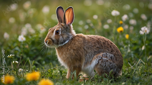 © GraphicTechno, Fototapeta premium Wild Rabbit in Flower Meadow: Close-up of Brown Hare