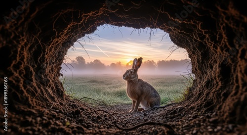 Fototapeta premium Wild rabbit in serene sunrise landscape viewed from burrow with misty fields...